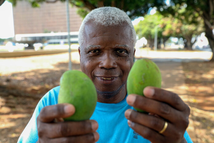 Fora do quintal de Wilto, a cena se repete em maior escala. No Eixo Monumental, em frente ao Palácio do Buriti, o comerciante Deusimar Pereira da Cruz vende pipoca no semáforo há cinco anos e acompanha de perto o vai e vem da temporada. “Todo ano, quando chega novembro, dezembro, eu tiro umas duas sacolas de manga por dia e levo pra casa, em Santo Antônio do Descoberto. O pessoal traz sacola, balde, estaciona o carro e vem derrubar as mangas com varas”, descreve.